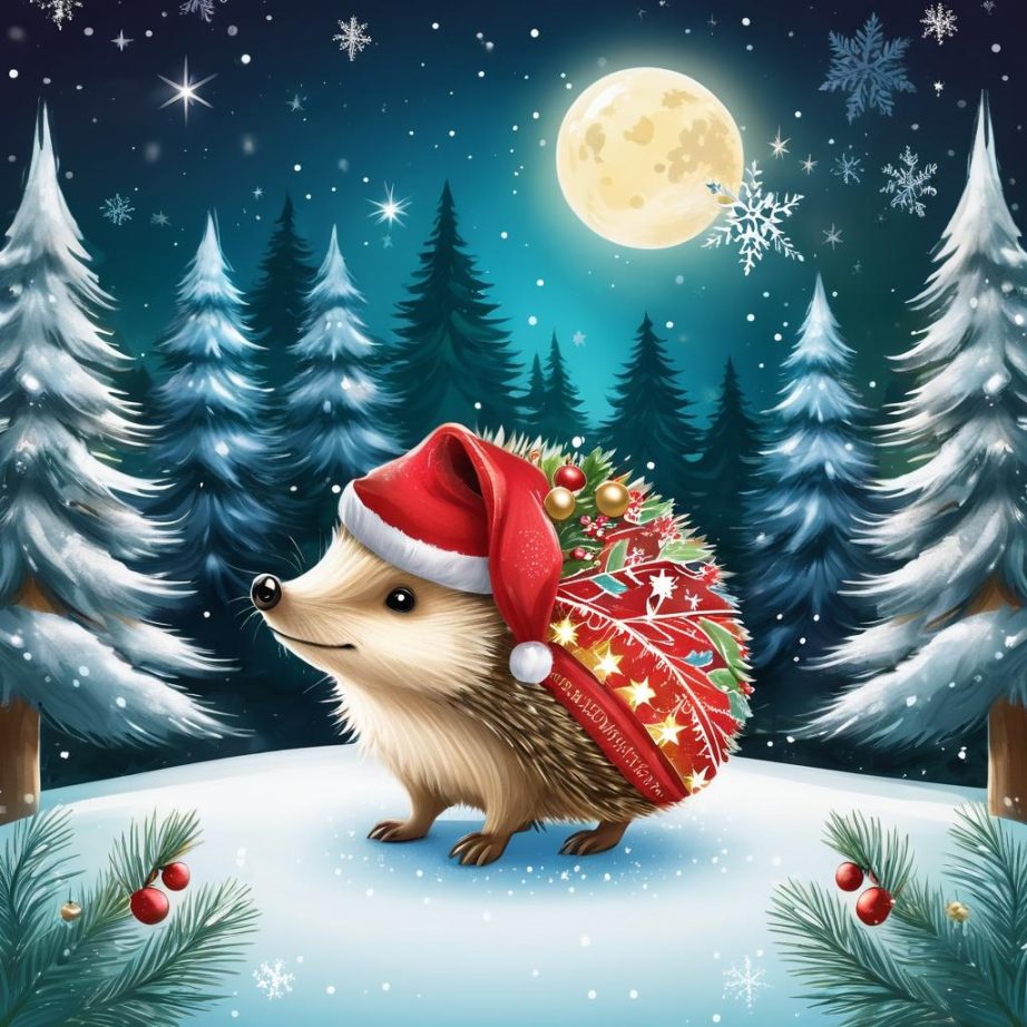 将刺猬的五彩图案融入圣诞主题,通过添加金色和银色装饰,如小星星和雪花,在背景中加入一些圣诞树和灯光元素来增强节日感。刺猬头顶可以装饰一顶小圣诞帽,背景可以设计成一个冬日森林的场景,增加温暖的灯光效果来体现节日的温馨感。