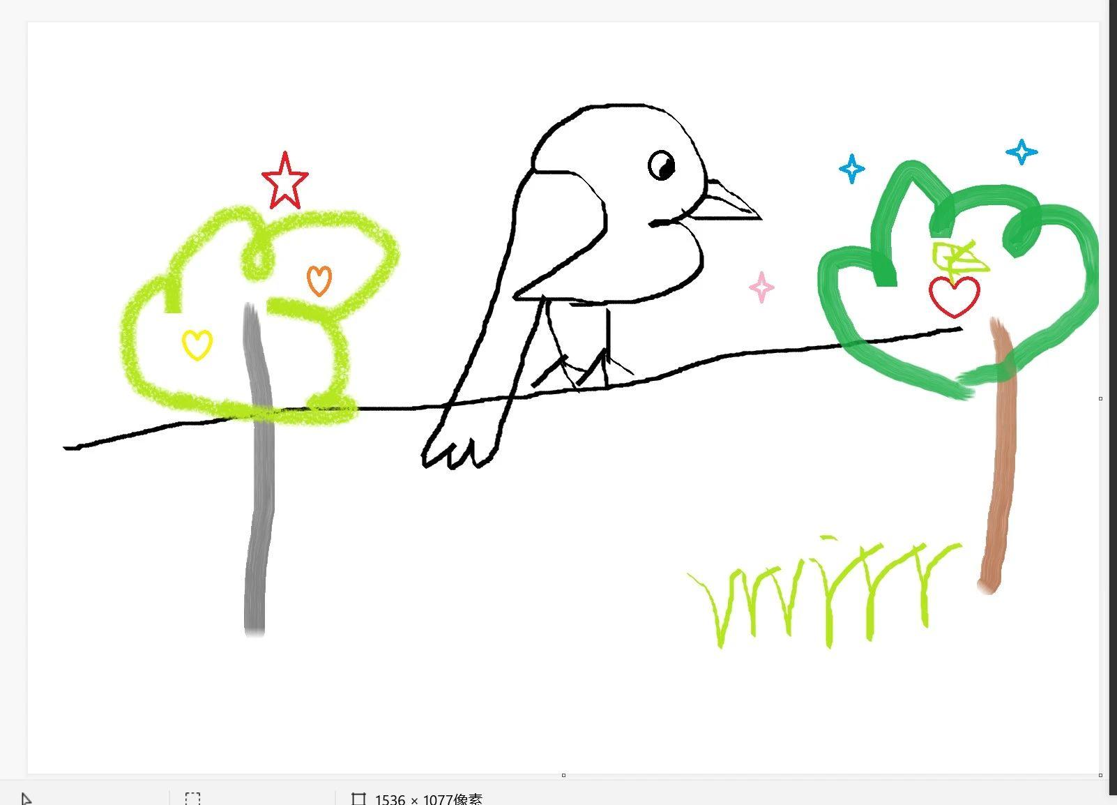 这幅画以简约线条勾勒出一只鸟站在树枝上的场景。画面中有抽象的树木与星星、心形等元素,整体色彩明亮但缺乏直接的节日元素。可以通过增加节日装饰如圣诞灯饰、雪花和圣诞树,增强圣诞氛围。线条的简洁性提供了很好的创作基础,并且色彩的应用可进一步丰富。