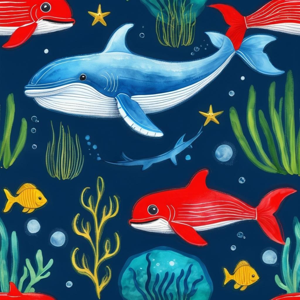 这幅儿童画作以其鲜艳的色彩和简单而富有表现力的线条,成功地捕捉了海洋世界的奇妙与和平。蓝色的鲸鱼和红色的小鱼在水中悠游自得,背景中的黄色星星和绿色水草为画面增添了生动的背景。这种通过大面积的色块和简单的形象所表达的独特风格,令人联想到类似Joan Miró的艺术风格,其作品同样以大胆的色彩和抽象的形象而著称。