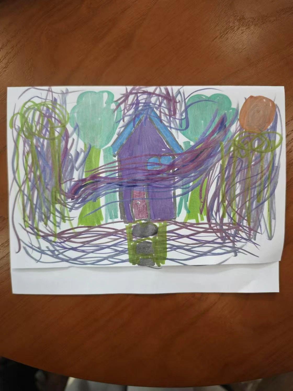 这幅画展现了一座房子,前景有树木和一个太阳,使用了丰富的颜色,如紫色、绿色和棕色。线条随意且充满活力,给人一种天真烂漫的感觉。画作可能传达了对自然的热爱和对家园温暖的向往。
