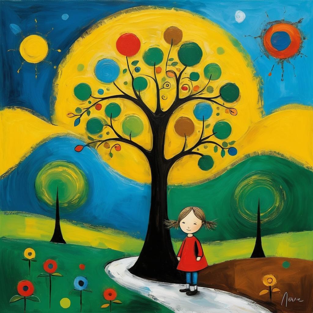 这幅儿童画作品使用了鲜艳的颜色和简单的线条,展现了一个小孩站在一棵大树旁的场景。画面中有两个标牌,分别写着‘入口’和‘出口’,显示出一种探索和冒险的主题。整体构图以黄色为主色调,象征着阳光和快乐。人物的表情简单而快乐,树木用绿色和棕色表现,充满自然气息。