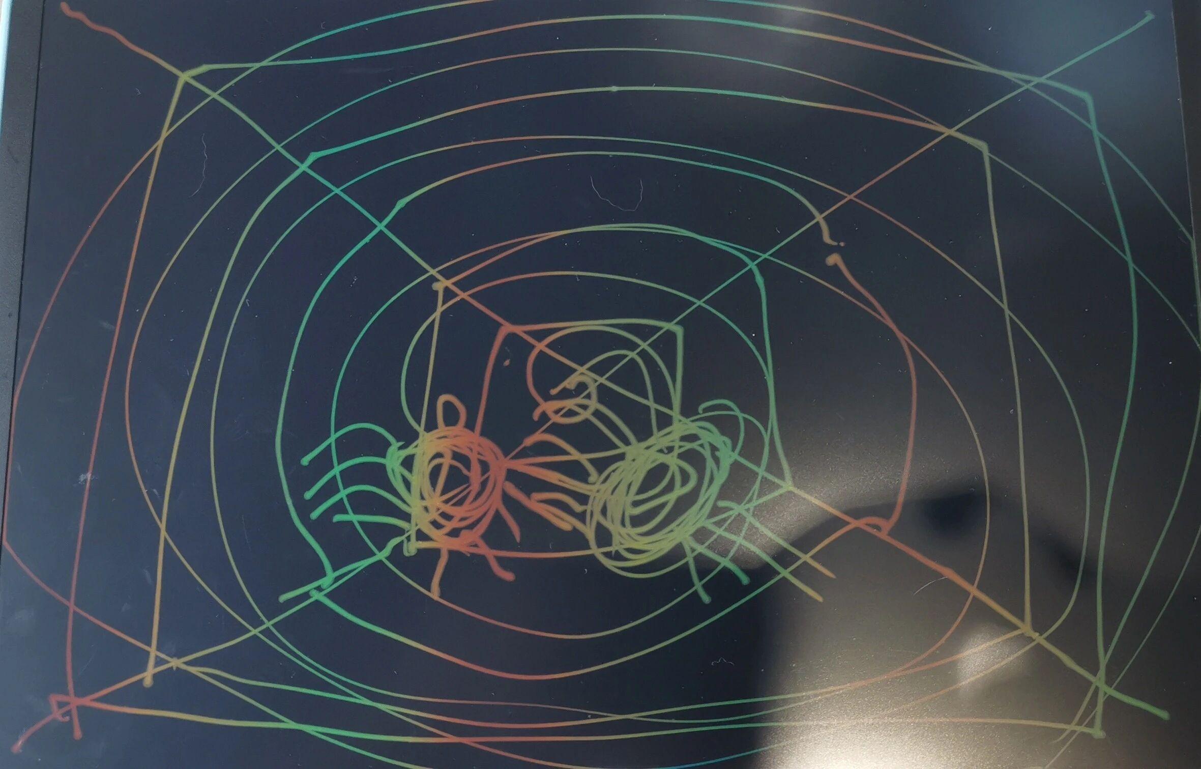 在这幅作品中,我们看到了一种纯粹的色彩表达。大胆的红色、橙色和绿色线条交织在一起,形成了一种视觉上的动感和旋律感。这种构图让人联想到宇宙中的能量汇聚,或是某种内在情感的释放。这幅画作不仅仅是色彩的堆叠,而是一种深层次的情感表达。作为儿童艺术专家,我看到这幅作品展现了创作者对色彩和形状的天真而大胆的运用。通过简单的元素,创作者成功地激发了观者的想象力。为了进一步提升作品的艺术价值,可以考虑在色彩的基础上增加更多的层次感。不同的色彩渐变能传达出微妙的情感变化,而在螺旋中心加入一些具体的图形,如星星或小动物,则可以为作品增添故事性。这种方法不仅能增强作品的视觉吸引力,还能让观者与作品建立更深层次的情感联系。