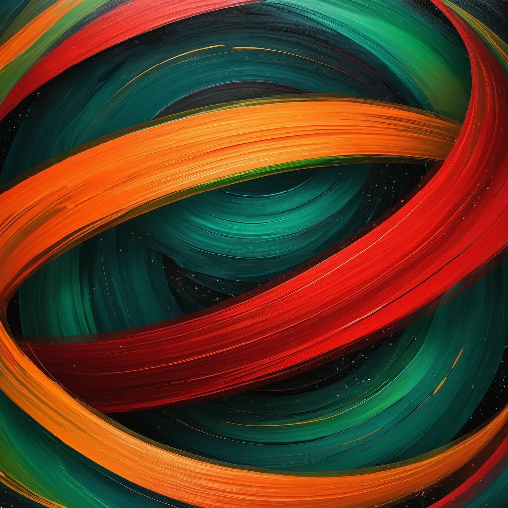 这幅作品以螺旋形的色彩线条为主要元素,形成了一种视觉上的向心力。明亮的红色、橙色和绿色交织在一起,似乎在表现某种动感或能量的释放。作品的构图中心集中,可能意在传达宇宙中心或能量汇聚的主题,给人一种深邃而神秘的感觉。