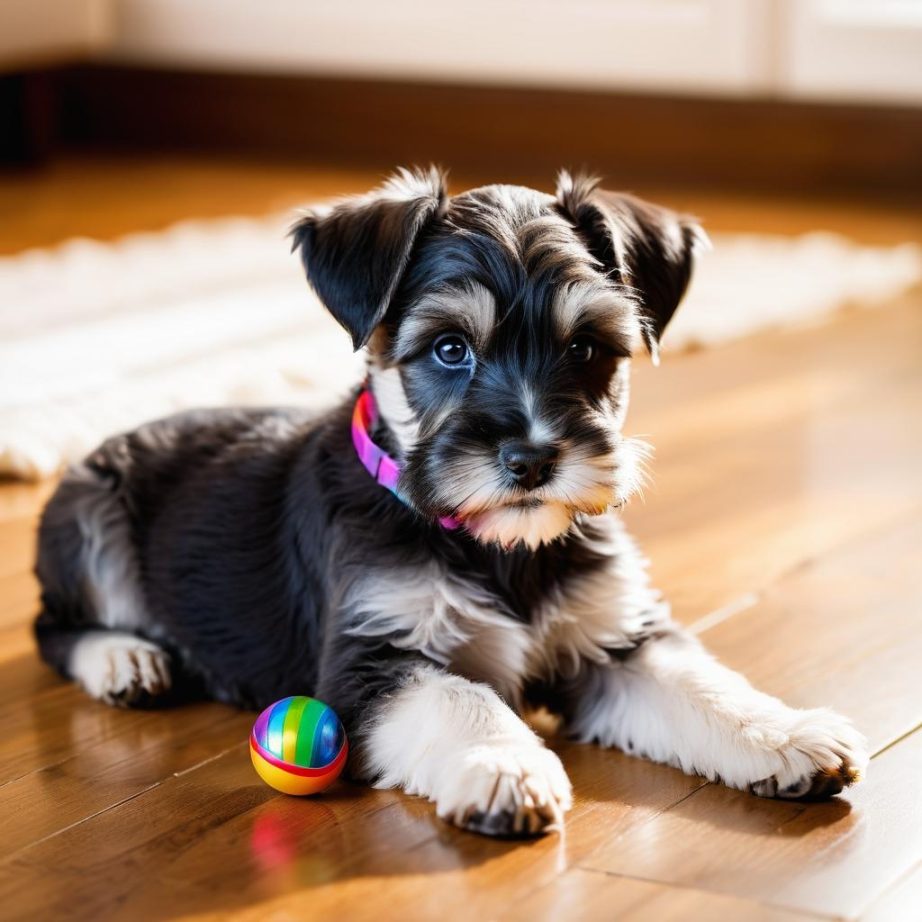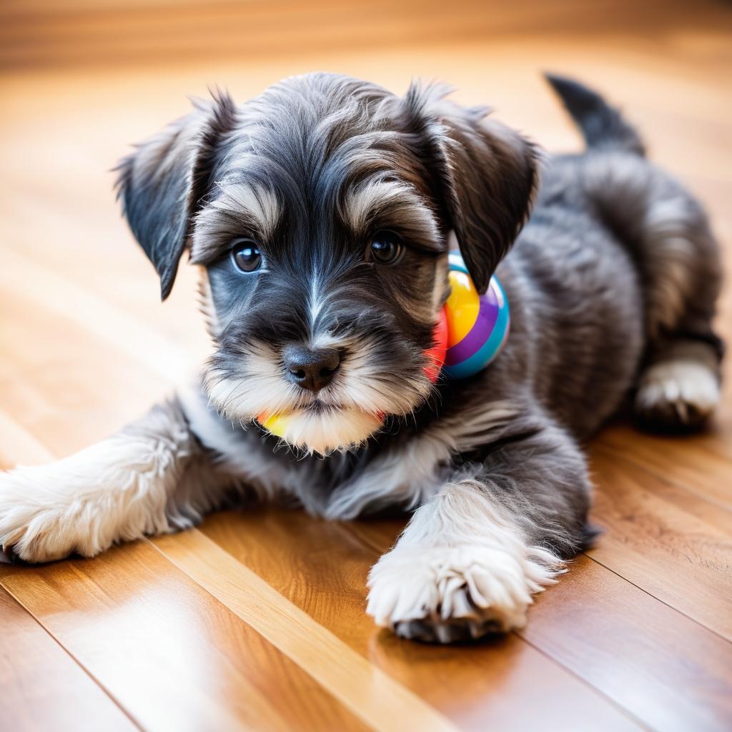照片中展示了一只可爱的狗趴在木地板上,背景较为简洁,狗狗的表情显得非常活泼和开心。狗的周围有一个彩色的玩具球,进一步强调了愉快和活泼的氛围。整体的色调温暖,木地板的纹理增加了画面的层次感。