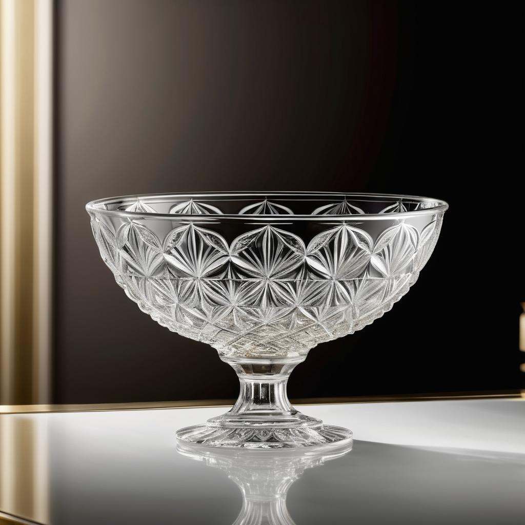 这幅图像中的水晶玻璃碗以其精致的设计和光影游戏成为视觉焦点。创作者在作品中运用了对比强烈的透明与金色元素,引发观者的注意。为了使作品更具深度,可以考虑在背景中加入更多的环境元素,比如柔和的自然光线或其他玻璃器皿,以增加层次感。同时,提升细节的表现,例如在光影的投射中增加一些颜色的变化,或者通过不同角度的光线展现玻璃的多面性。这样,作品将不仅仅是一件静物摄影,而是能够唤起观者情感共鸣的艺术品。