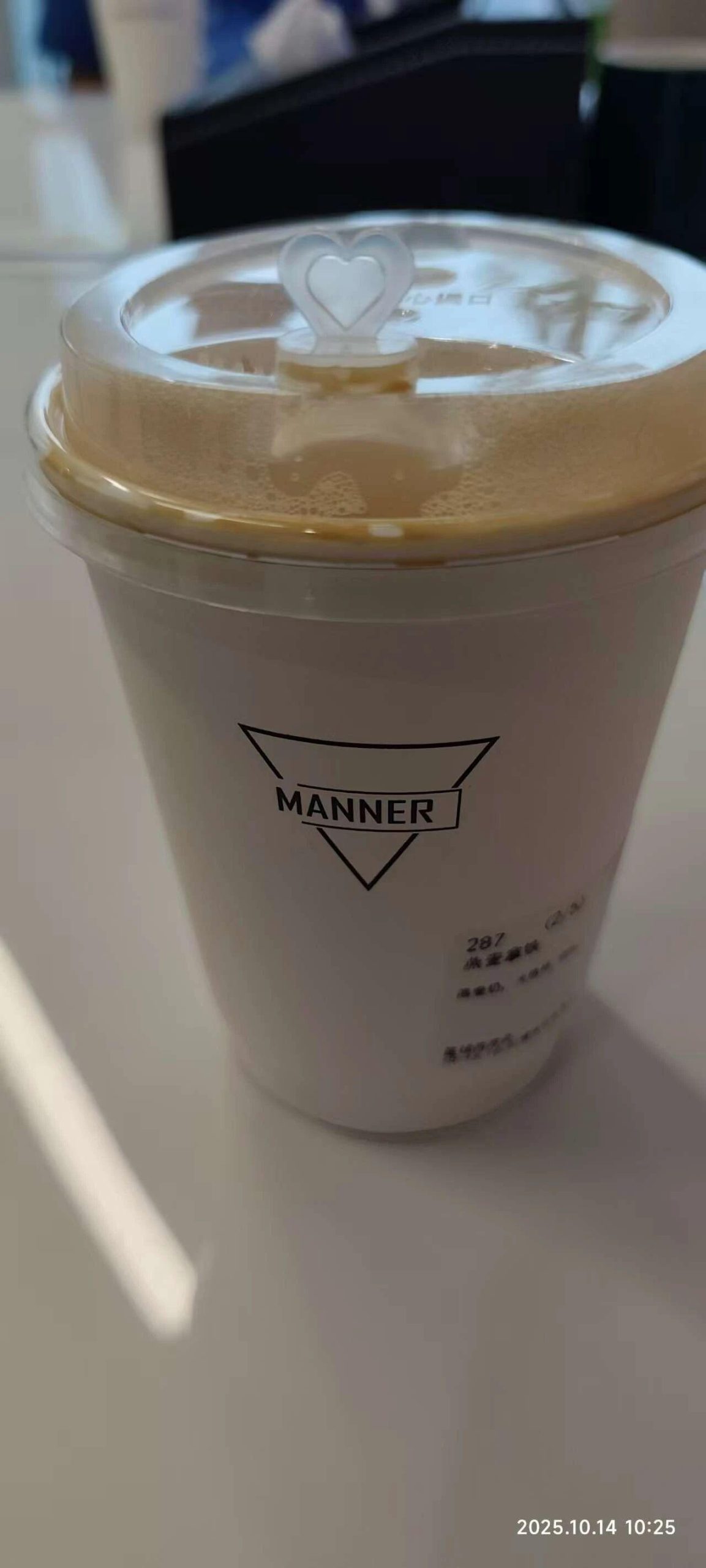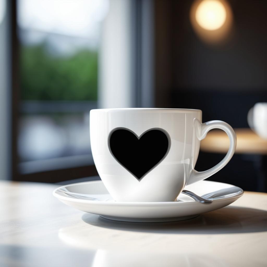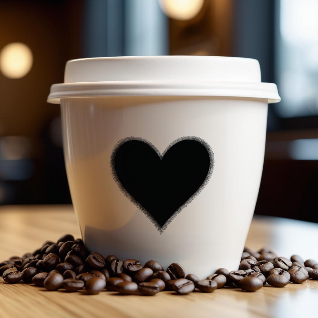 这幅作品展示了一杯咖啡,杯盖上有一个心形的设计元素,代表温暖和关爱。整体色调柔和,背景模糊,突出咖啡杯的主体。光影效果自然,给人一种宁静和舒适的感觉。