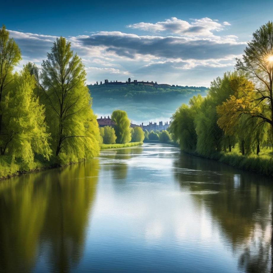 这幅作品的主要特点在于其自然的宁静氛围和光影效果。可以通过增强色彩饱和度和增加细节的方式提升作品的感染力。例如,可以在河岸的植被细节上加以雕琢,使其更具生命力。天空的云层可以通过增加颜色层次,使其更具动态感。通过这些调整,作品可以更好地捕捉自然的瞬间美感,使观者更深入地感受到自然的力量与宁静。