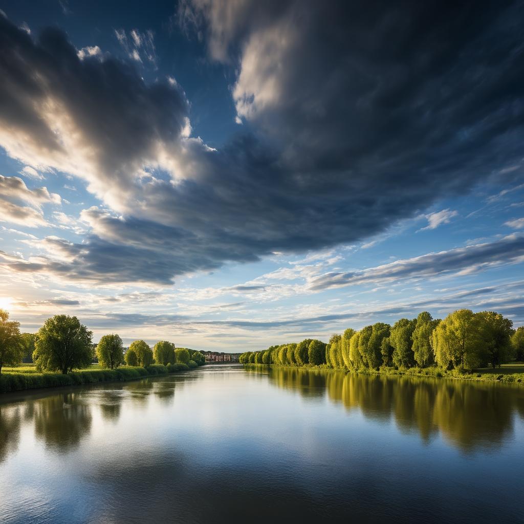 这幅作品让人感受到一种宁静的力量。在画面中,河流的静谧与天空的云层形成了鲜明对比,阳光透过云隙洒在水面上,产生了柔和的光影效果。远处的树木和建筑剪影为画面增添了深度和层次感。作为环境艺术策展人,我认为这幅作品成功地捕捉到了自然的瞬间美感,传达了人与自然和谐相处的主题。通过增强色彩和增加细节,这幅作品可以在视觉上更具冲击力,进一步引发观者对自然的敬畏与思考。作品中所体现的静谧不仅是一种视觉体验,更是一种心灵的宁静。在现代社会中,快节奏的生活常常让人忽视自然之美,而这幅作品正是提醒我们停下脚步,感受周围环境的魅力。