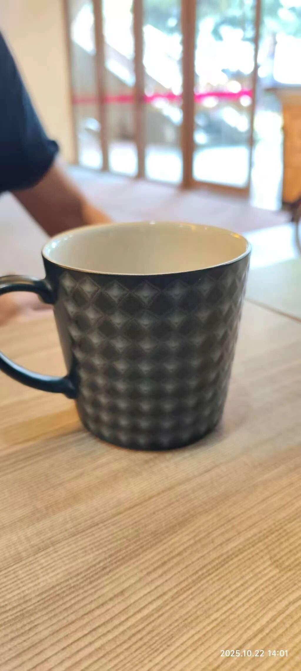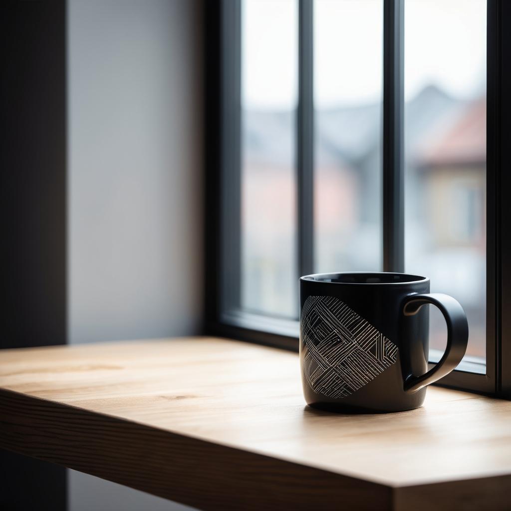 这幅作品中,主体是一只带有几何图案的黑色杯子,放置在木质桌面上。背景有模糊的窗户,可以看到自然光透过窗户洒进来。整体色调自然,温暖,构图简单而直接,给人一种舒适和日常的感觉。