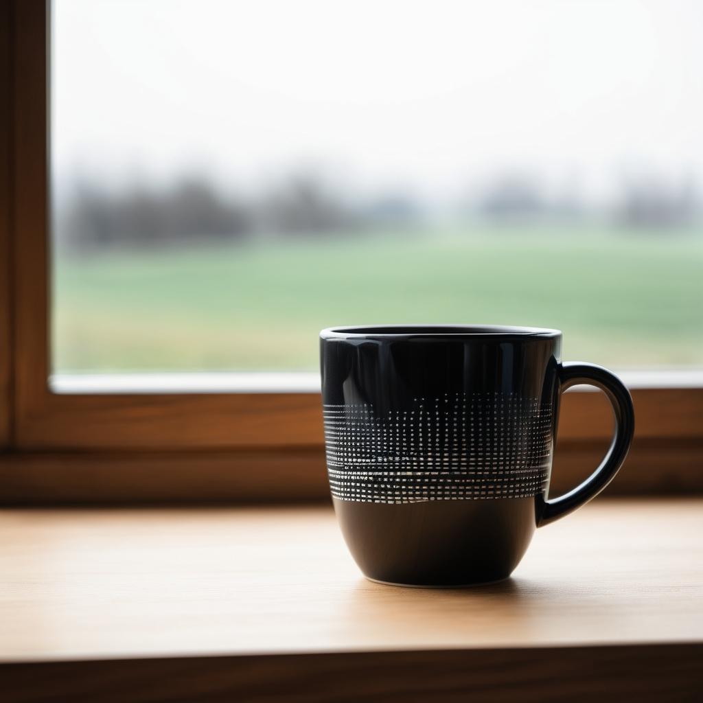这幅作品以其简单而富有表现力的构图,成功地将日常生活中的一个平凡瞬间转化为艺术。黑色杯子的几何图案在光影变化中呈现出独特的质感,这种设计不仅增加了视觉上的趣味性,也让人感受到日常物件中的艺术潜力。背景中模糊的窗户透出的自然光,营造出温暖而舒适的氛围,仿佛邀请观者在此享受一杯热饮的宁静时光。