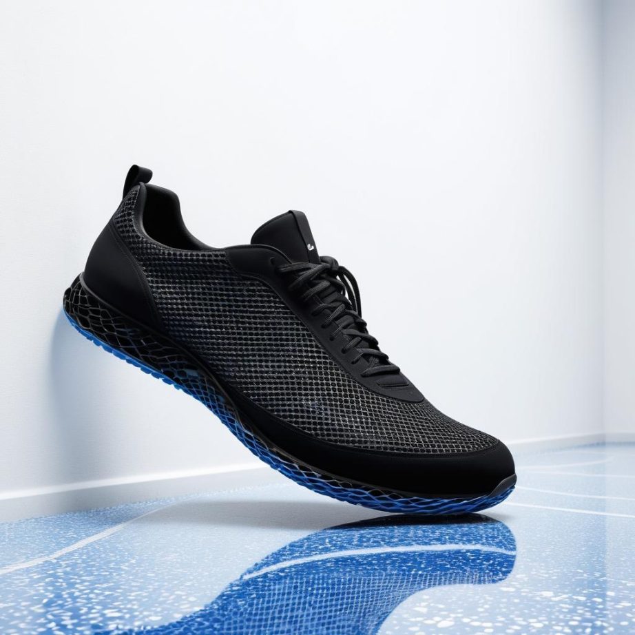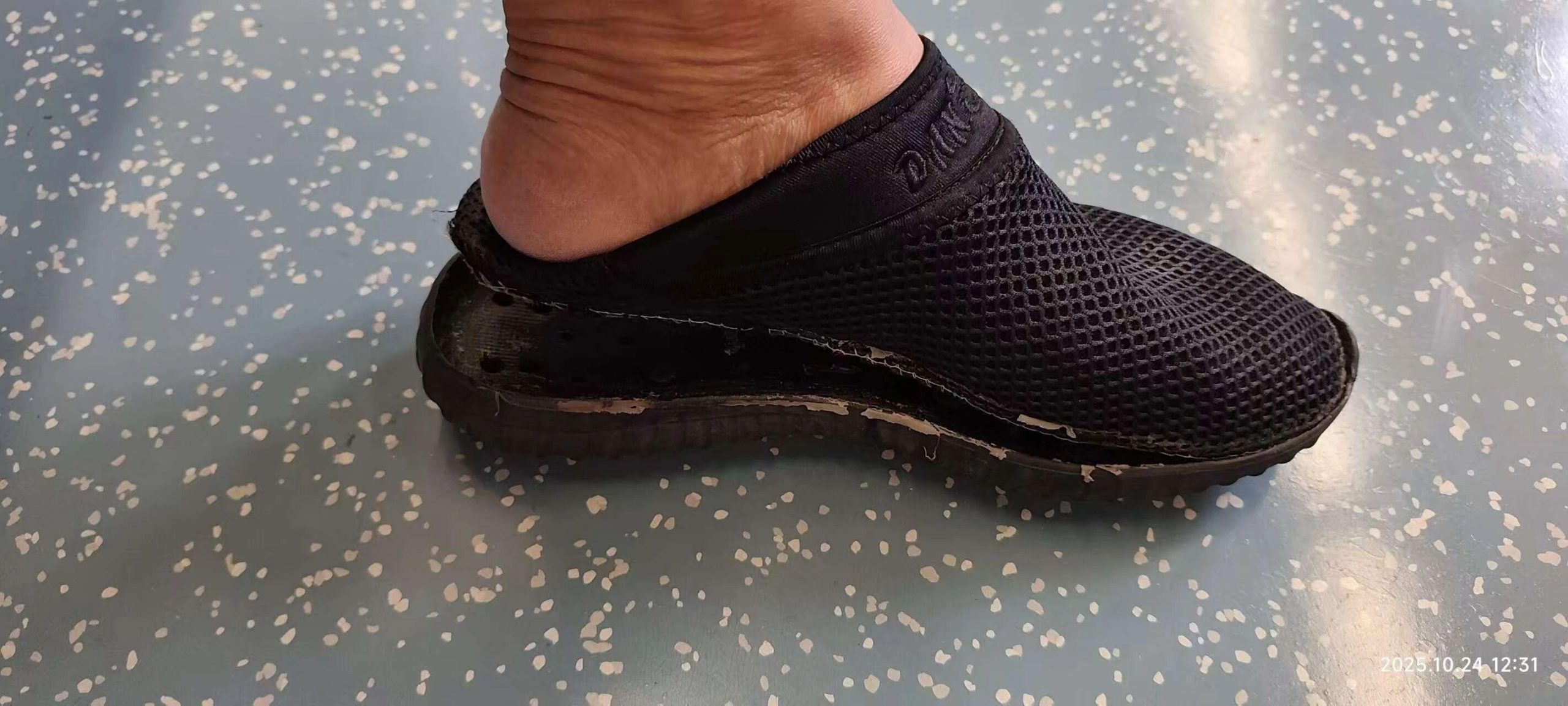 图片展示了一只穿着黑色网状鞋的脚,鞋底似乎与地面分离,呈现出一种不稳定的状态。背景是蓝色和白色的斑点地板,增强了画面的对比度。整体色调较为冷淡,突出了脚与鞋之间的关系,可能传达出一种对日常生活中不便或意外的反思。