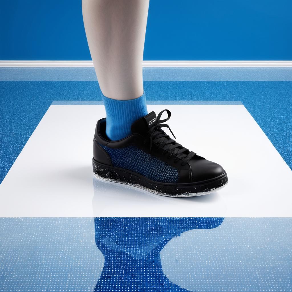 在这幅名为《鞋履与日常》的作品中,艺术家通过一只穿着黑色网状鞋的脚,传达了日常生活中的微小不便与不稳定感。鞋底与地面分离,这种不寻常的状态不仅吸引了观者的目光,也引发了对生活中意外事件的反思。背景上蓝白相间的斑点地板,提供了一个冷色调的环境,使得脚与鞋的关系更加突出和引人注目。