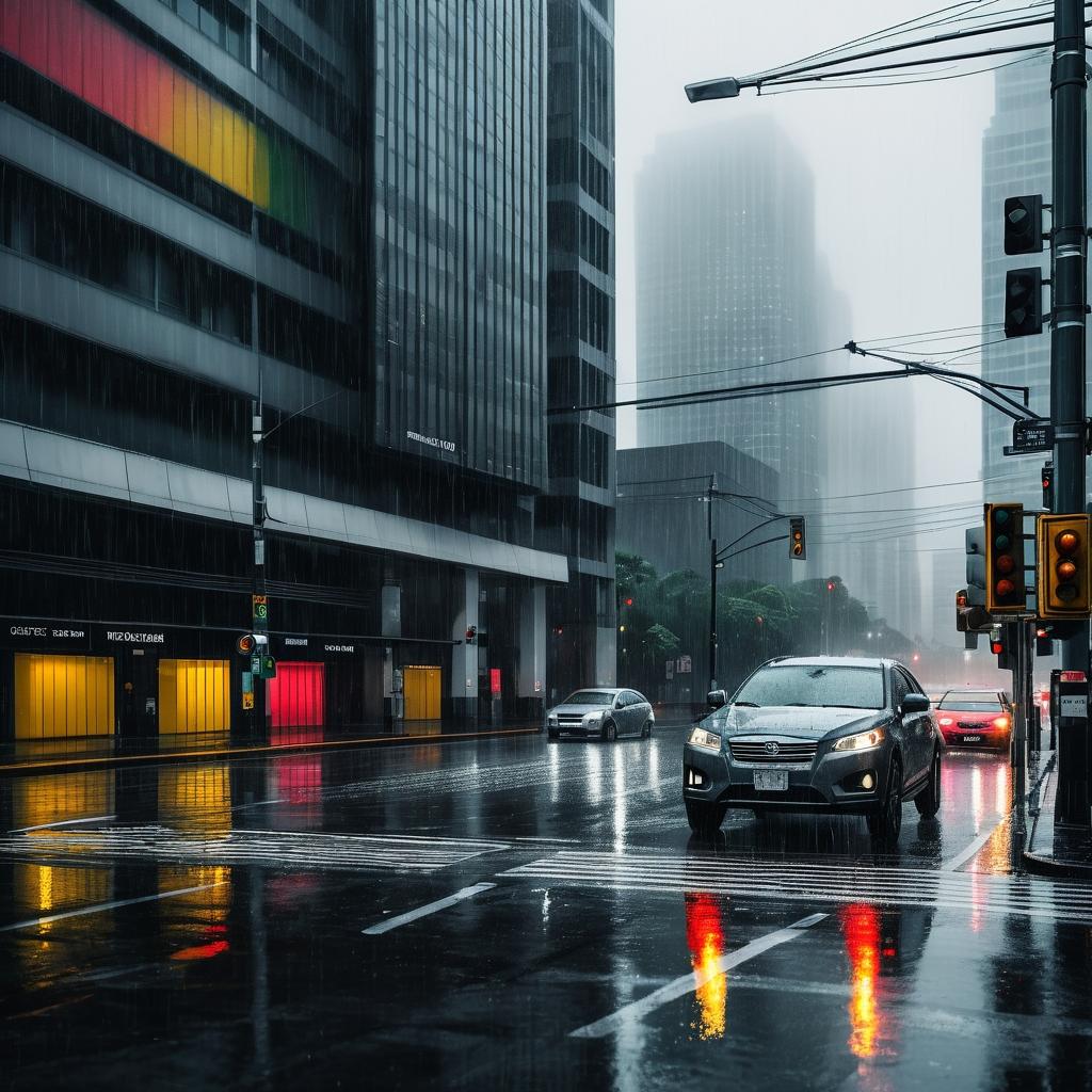 这幅照片展现了一个典型的城市雨天场景,汽车在红绿灯前静静等待,背景是模糊的高楼大厦。雨水在车窗上的细腻痕迹,为画面增添了一层朦胧感,仿佛在诉说着城市生活中的孤独与等待。这种情感通过阴暗的色调和模糊的视觉效果被强化,这也正是这幅作品打动人心的地方。作为环境艺术策展人,我认为这幅作品可以通过加入色彩对比来提升其艺术性。例如,在画面中加入一把颜色鲜艳的雨伞,或是让某位行人的装束成为画面的焦点,能有效地打破单调的灰色调,为观者提供一个视觉上的“重心”。此外,调整天空的色调对比,增强画面的层次感,也能使作品更具吸引力。通过这样的再创作,作品不仅仅是记录雨天街景,更是对都市生活情感的一次深刻探讨。