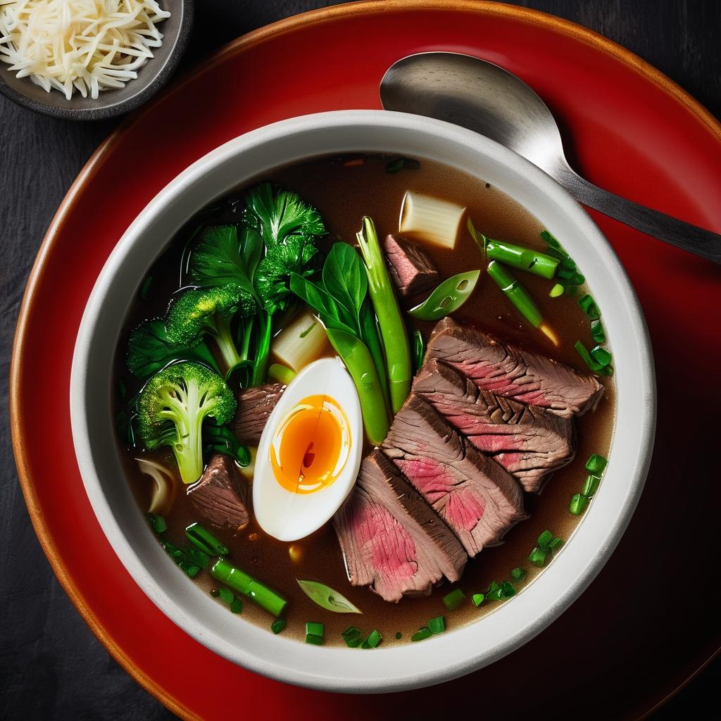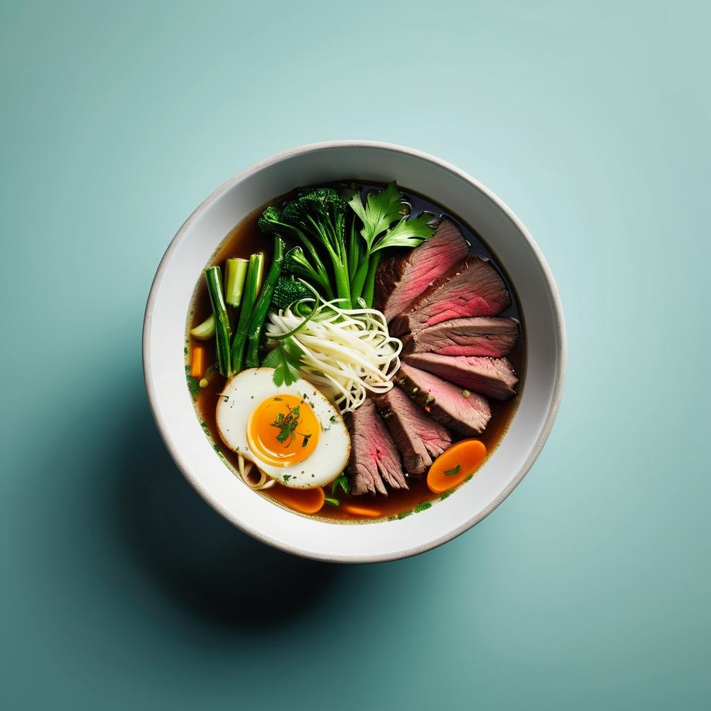 一碗简单的牛肉汤,承载着多少人的味蕾记忆和情感共鸣。图中的这碗牛肉汤通过俯视视角展示了食物的丰盛与细节,深色的汤汁与切片牛肉形成鲜明对比,绿色蔬菜点缀其中,为画面增添了生机。在美食摄影中,如何通过镜头捕捉食物的质感与温度,是提升作品艺术性的关键所在。利用光影效果,强调汤的热气或牛肉的光泽,可以赋予作品更多的生命力。而如果能加入一些背景故事,比如这道菜的文化渊源或食材的选择过程,将使作品更具深度和情感的感染力。这不仅是一种视觉上的享受,更是一种心灵的共鸣。通过这种方式,食物摄影不仅仅是对美味的记录,更是对文化和情感的表达。