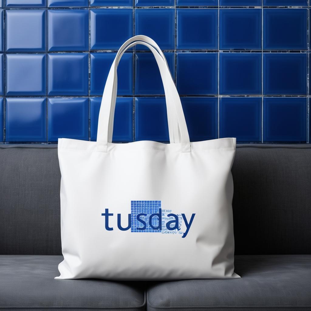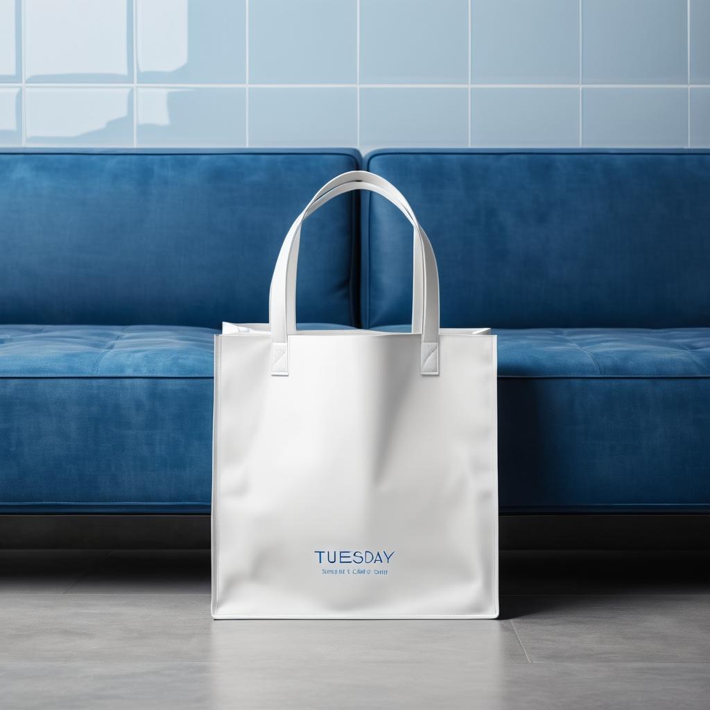 这幅作品展示了一只印有’Tuesday’字样的白色环保袋,放置在深色沙发上。背景是蓝色瓷砖墙面,色调冷静而简约。整体构图干净,色彩对比鲜明,传达了一种现代简约的生活方式和环保理念。