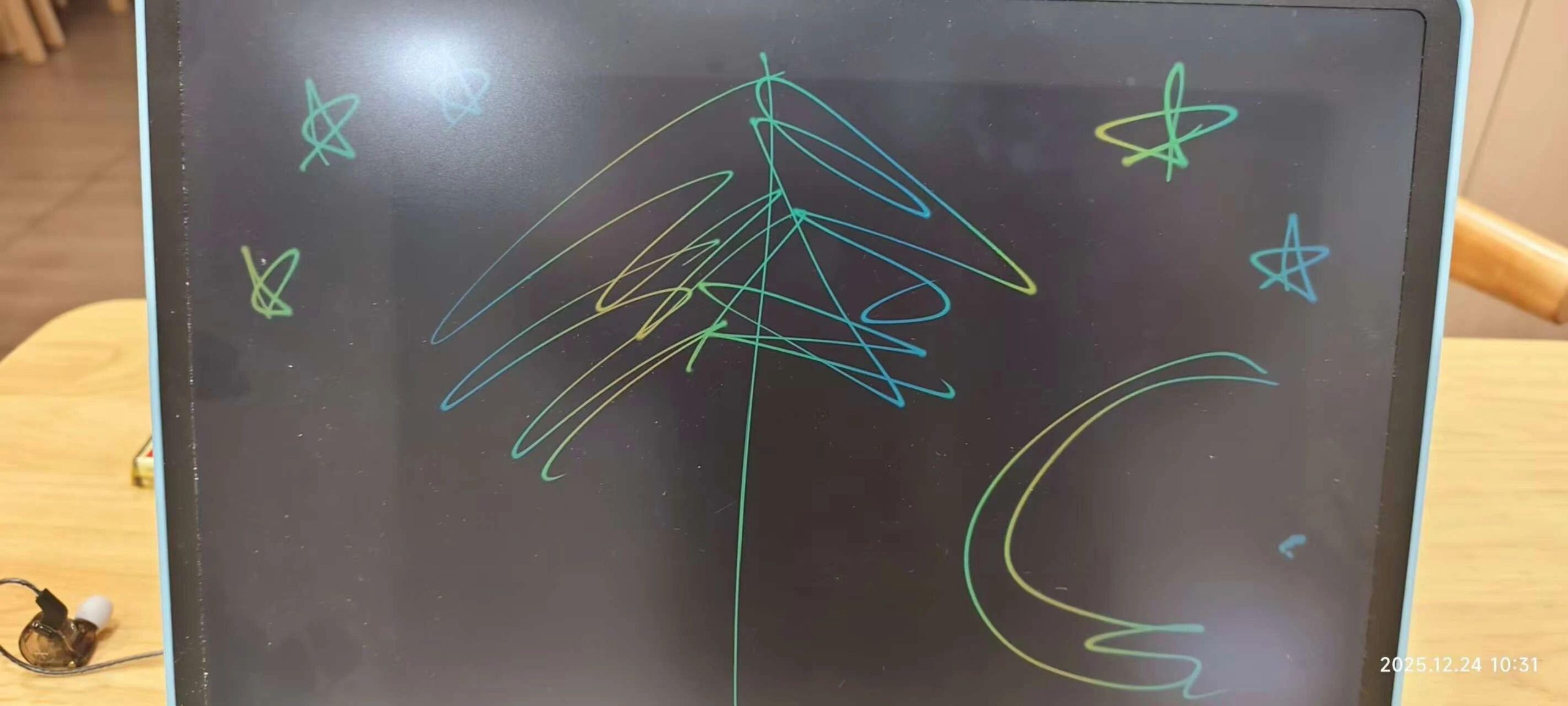 这幅简单而富有表现力的作品通过几条流畅的线条和几何形状,成功地传达了圣诞节的欢乐气氛。中心位置的圣诞树用绿色和蓝色线条勾勒,虽然缺乏复杂的细节,但正是这种简约的表现形式,让观众能够自由地想象和感受节日的氛围。星星的点缀增添了画面的动感和活力,象征着节日的喜庆。简约艺术的魅力在于它不依赖于繁复的细节,而是通过形状和色彩的搭配,传递出一种纯粹的情感体验。在提升作品时,创作者可以尝试融入更多的节日元素,例如在圣诞树上添加彩灯和装饰品,或是在背景中融入暖色调的灯光效果,营造出温馨的节日氛围。通过这些细节的丰富,作品不仅能更好地抓住观众的眼球,还能在情感上引起更深层次的共鸣。