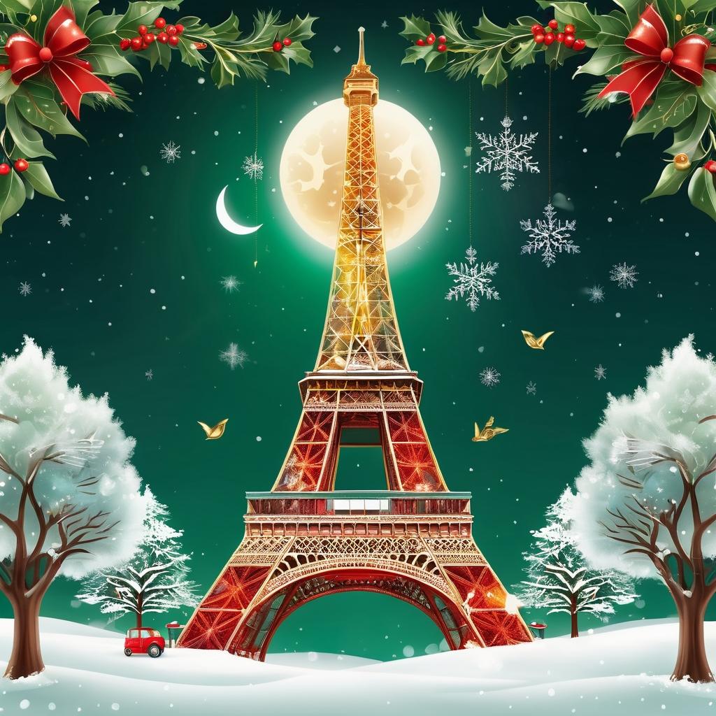 如果希望将这幅作品升华为一张充满圣诞节氛围的贺卡,可以通过细节上的调整来实现。首先,可以在埃菲尔铁塔上增加精致的灯光效果,使其在画面中更加闪耀。树木则可以添加雪花的细节,进一步提升节日的氛围。同时,将整体色调调整为更温暖的金色和红色,可以更好地契合圣诞节的主题。在星空中加入流星或更多的星星,也能为画面增添更多的动态感和活力。