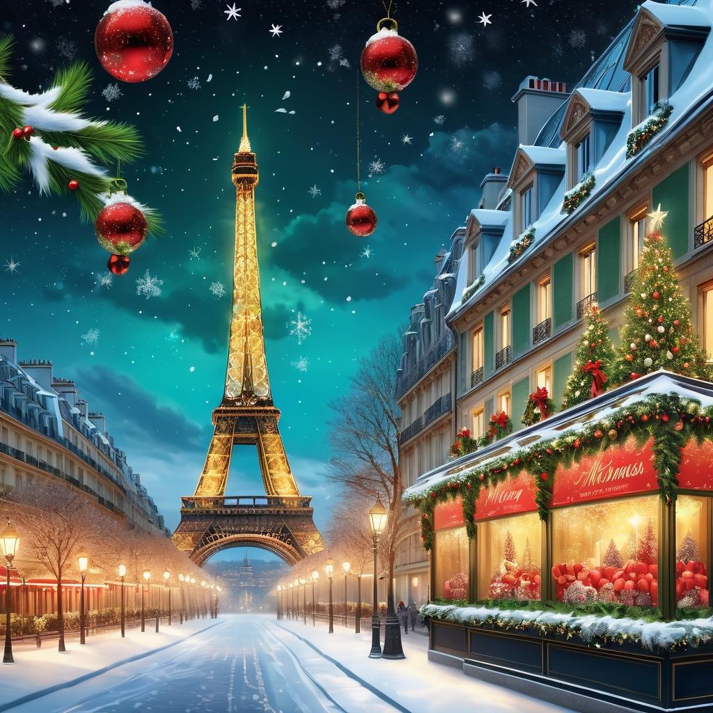 通过这些细节上的提升,这幅作品将不仅仅是一幅浪漫的巴黎夜景,更是一张充满节日温馨与欢乐的圣诞贺卡,让人感受到节日的温暖和喜悦。