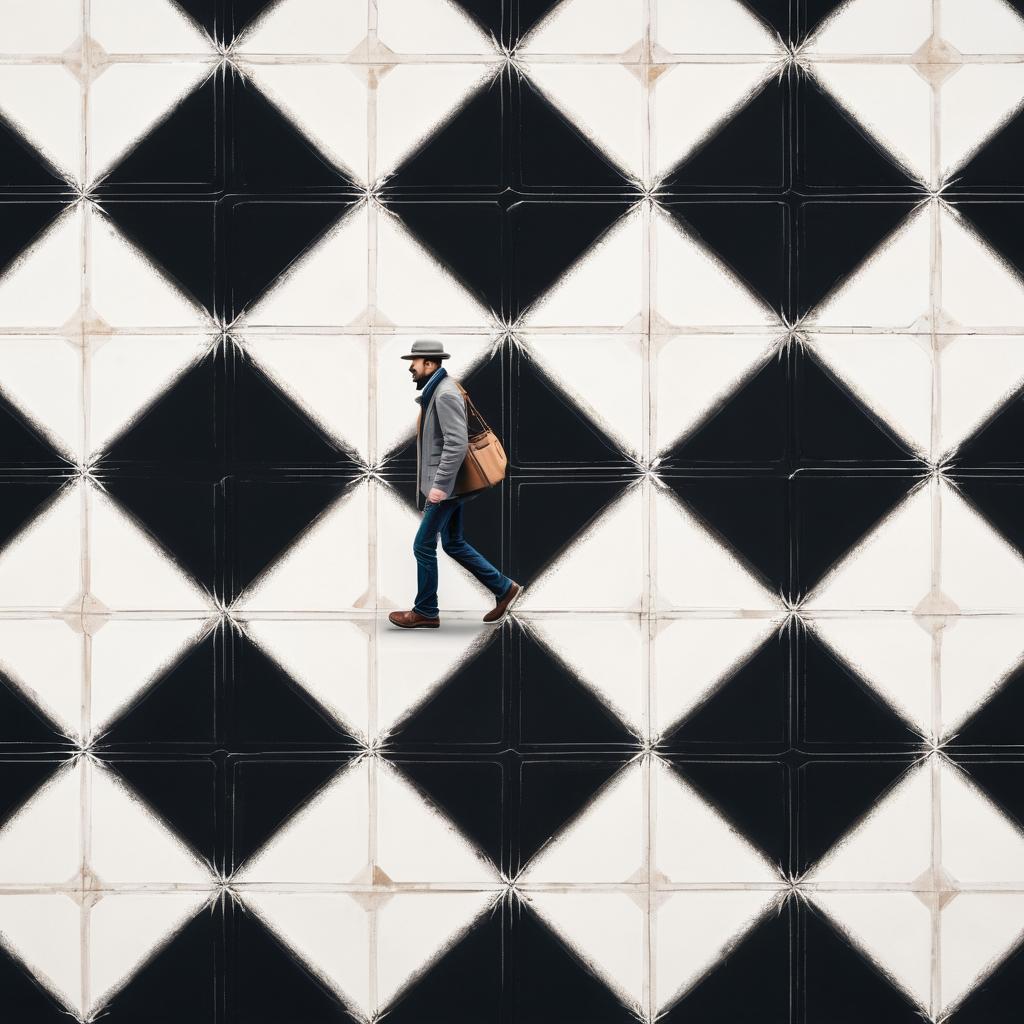 这幅作品的核心在于几何图案地板所带来的视觉冲击力,与行走在其上的人物形成对比,突出强调了空间与人的互动。为了提升作品的艺术性,可以尝试在图案中加入更多的色彩变化,或者通过光影的运用增强地板的立体感。同时,可以通过慢速快门捕捉人物的模糊运动,进一步强调时间的流动感。这样的处理将使作品在表现日常生活的同时,更具艺术层次感和视觉吸引力。