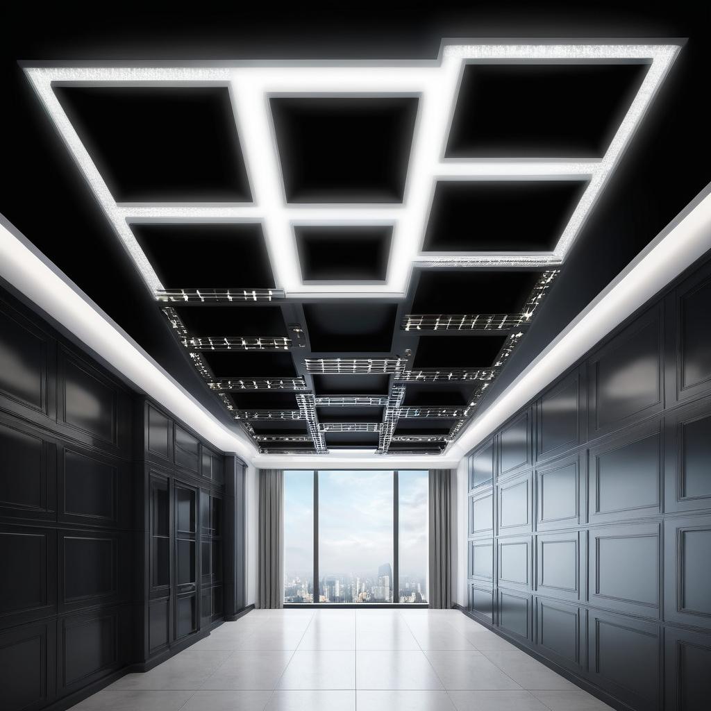 这幅图片展示了一个现代建筑的天花板,采用几何形状的灯光布局。明亮的方形灯具排列在一个更大的矩形框架内,形成了一种对称且富有现代感的设计。整体色调偏暗,突出灯光的冷色调,可能传达出一种未来感或科技感。