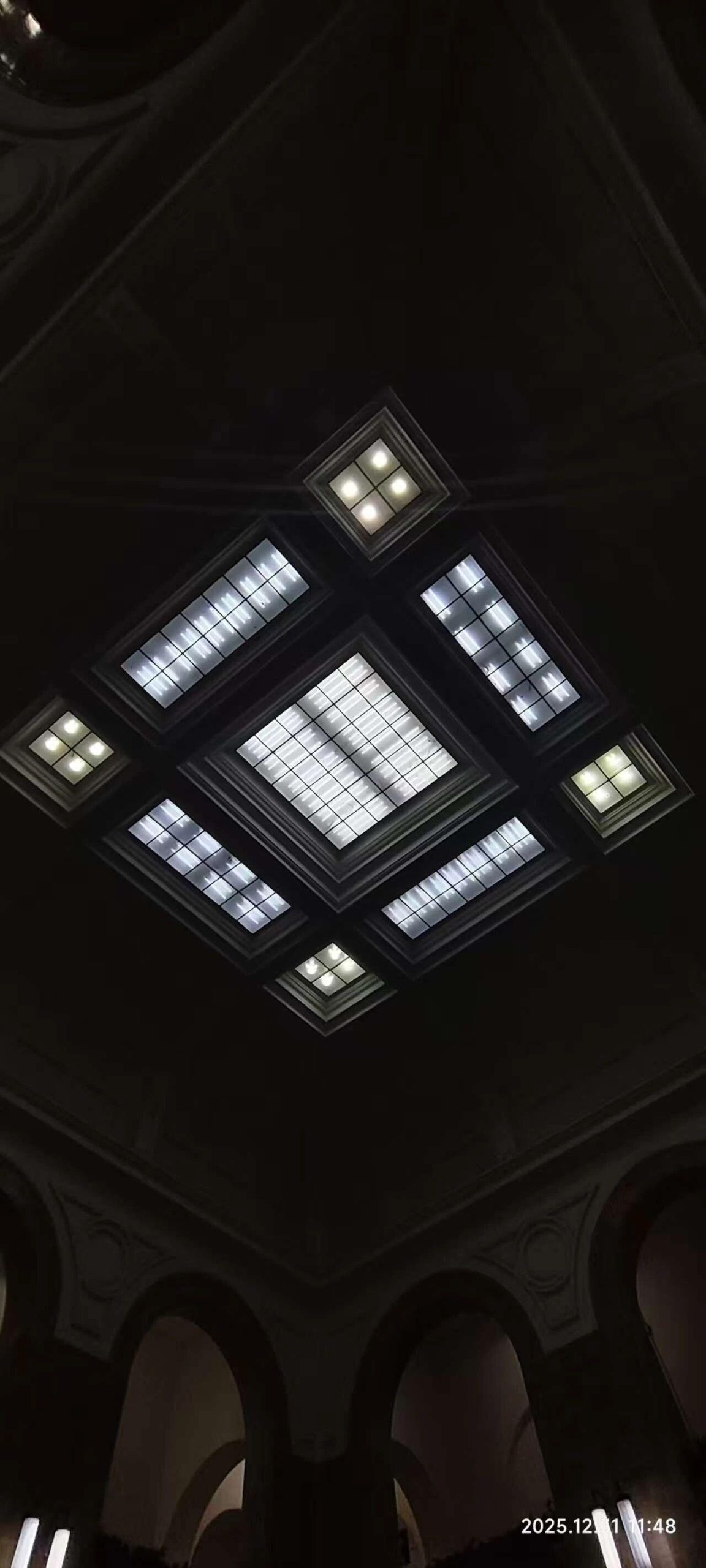 这幅图片展示了一个现代建筑的天花板,采用几何形状的灯光布局。明亮的方形灯具排列在一个更大的矩形框架内,形成了一种对称且富有现代感的设计。整体色调偏暗,突出灯光的冷色调,可能传达出一种未来感或科技感。