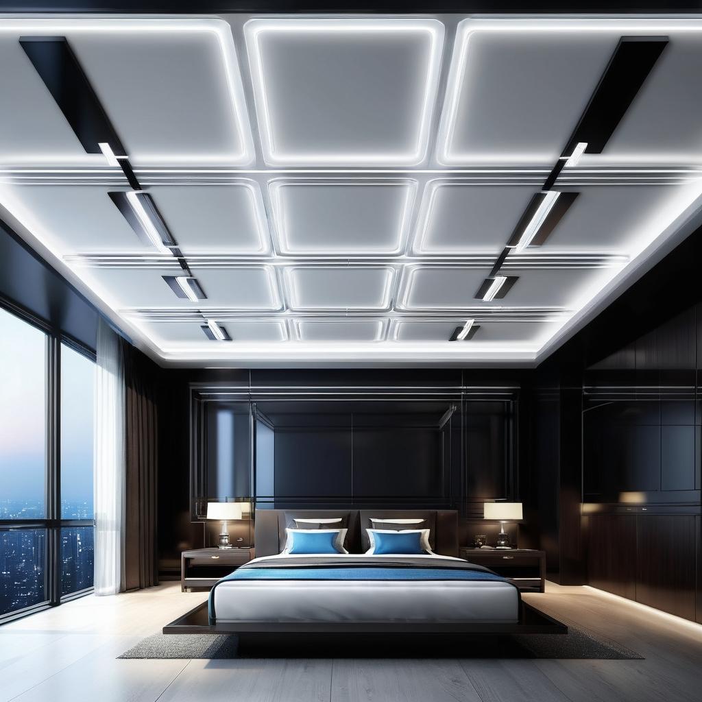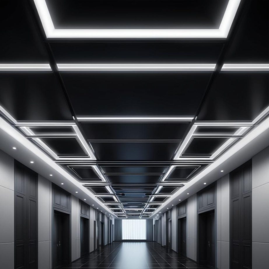 这幅图片展示了一个现代建筑的天花板,采用几何形状的灯光布局。明亮的方形灯具排列在一个更大的矩形框架内,形成了一种对称且富有现代感的设计。整体色调偏暗,突出灯光的冷色调,可能传达出一种未来感或科技感。
