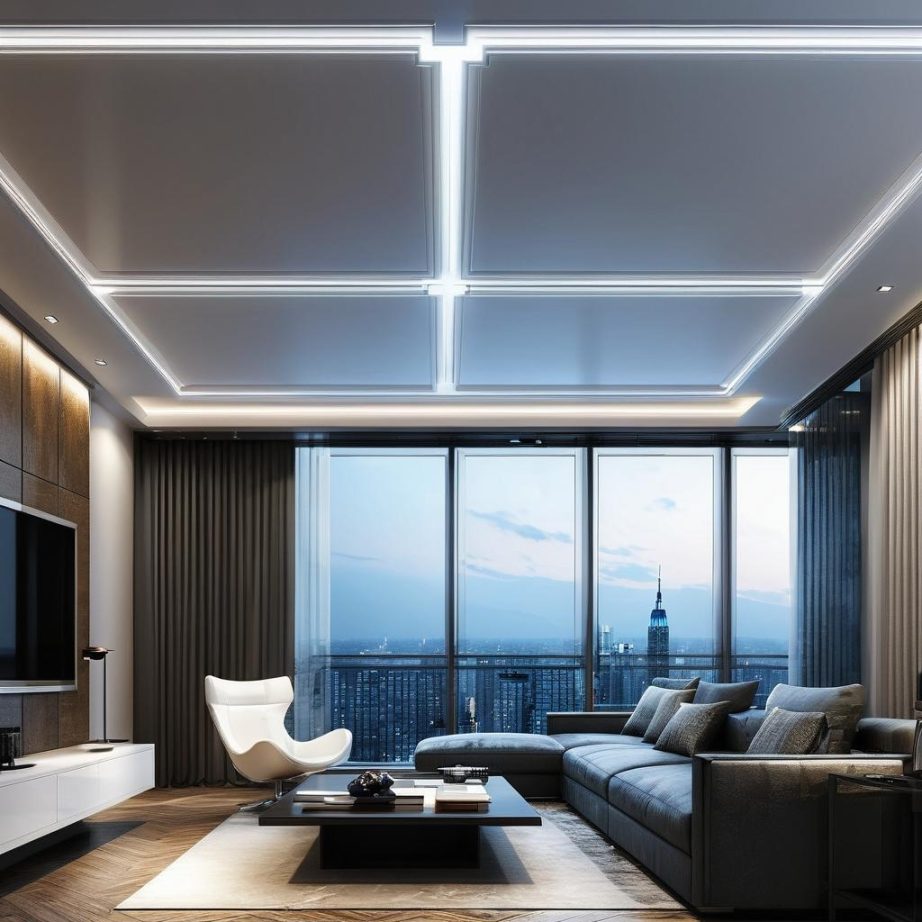 这幅图片展示了一个现代建筑的天花板,采用几何形状的灯光布局。明亮的方形灯具排列在一个更大的矩形框架内,形成了一种对称且富有现代感的设计。整体色调偏暗,突出灯光的冷色调,可能传达出一种未来感或科技感。