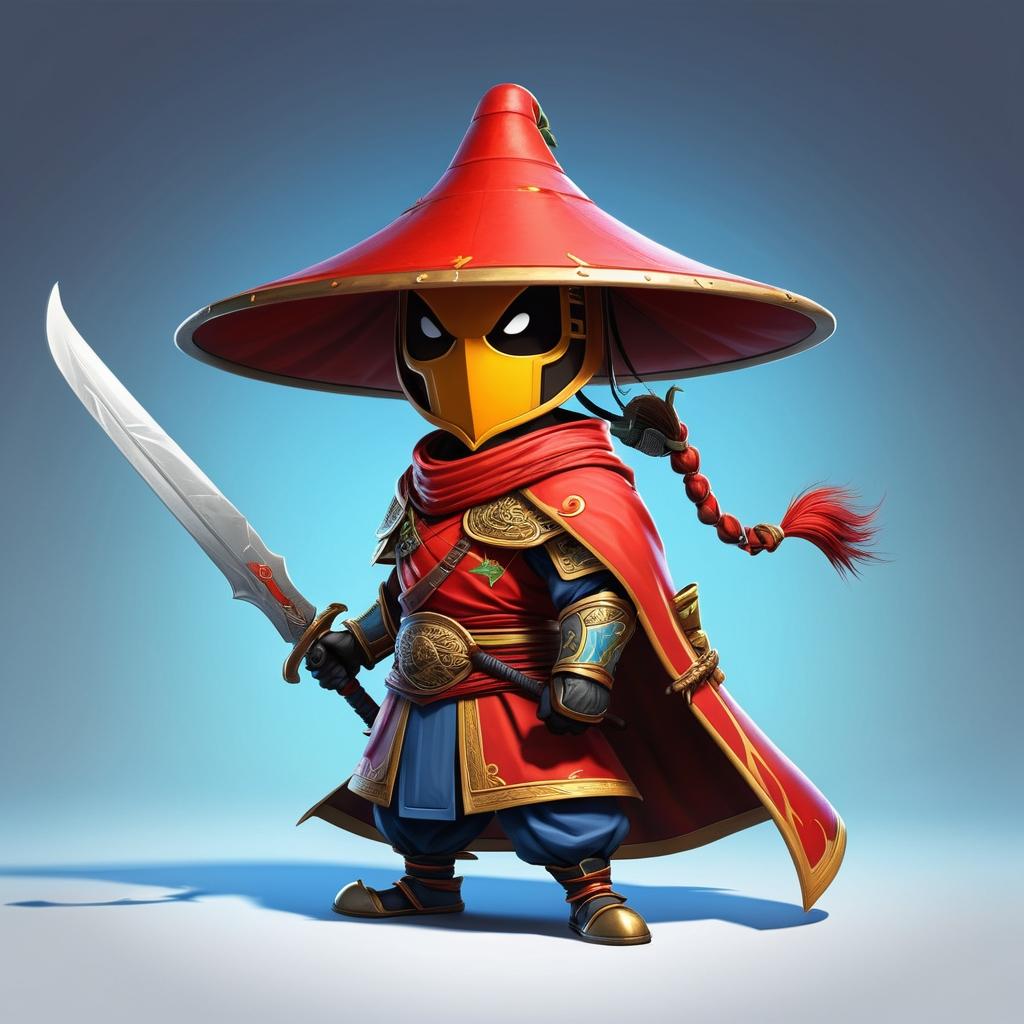 这幅作品展示了一位拟人化的辣椒武士,头戴斗笠,手持弯刀,形象生动且富有幽默感。作品使用了简单的线条和红色填充,创造了一个具有卡通风格的角色。画面背景为空白,使得角色更加突出,整个作品传达了一种轻松愉快的气氛。