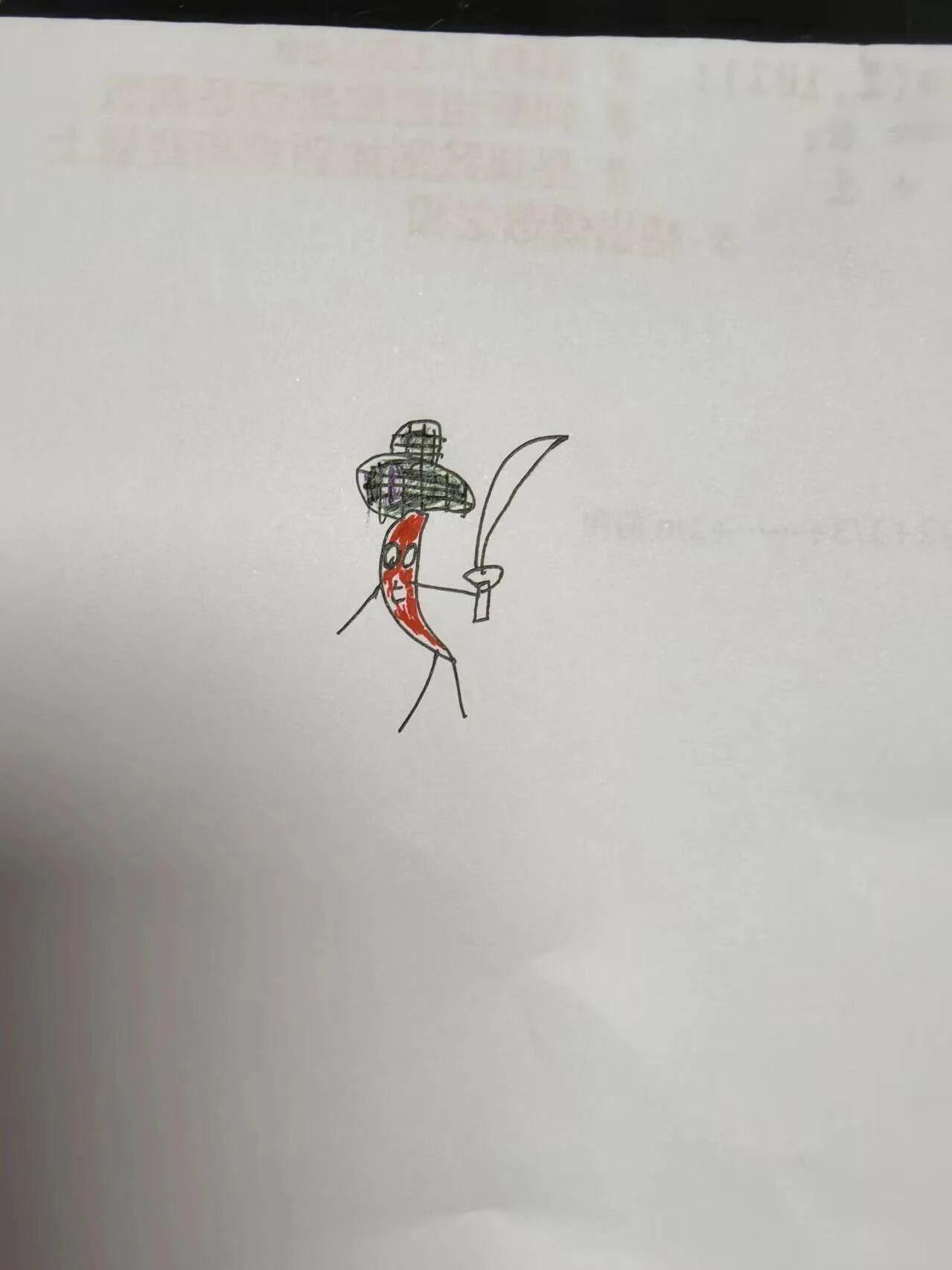 在这幅幽默而生动的作品中,我们看到了拟人化艺术的无限可能性。作者通过简单的线条和鲜明的色彩,成功地将一根普通的辣椒转化为一个充满个性和活力的武士形象。这样的艺术创作不仅激发了观众的想象力,也为艺术家提供了一个探索各种情感和故事的途径。拟人化是儿童艺术中常见的一种手法,它能够帮助儿童通过熟悉的物体和角色来理解更复杂的概念和情感。在艺术教育中,鼓励孩子们进行类似的创作活动,可以促进他们的想象力和创造力的发展。通过为这些角色创造背景故事和场景,孩子们不仅可以提高他们的绘画技巧,还能锻炼他们的叙事能力。拟人化艺术的魅力在于其能够将看似普通的事物赋予生命和性格,使观众在欣赏作品的同时,感受到无尽的乐趣和启发。