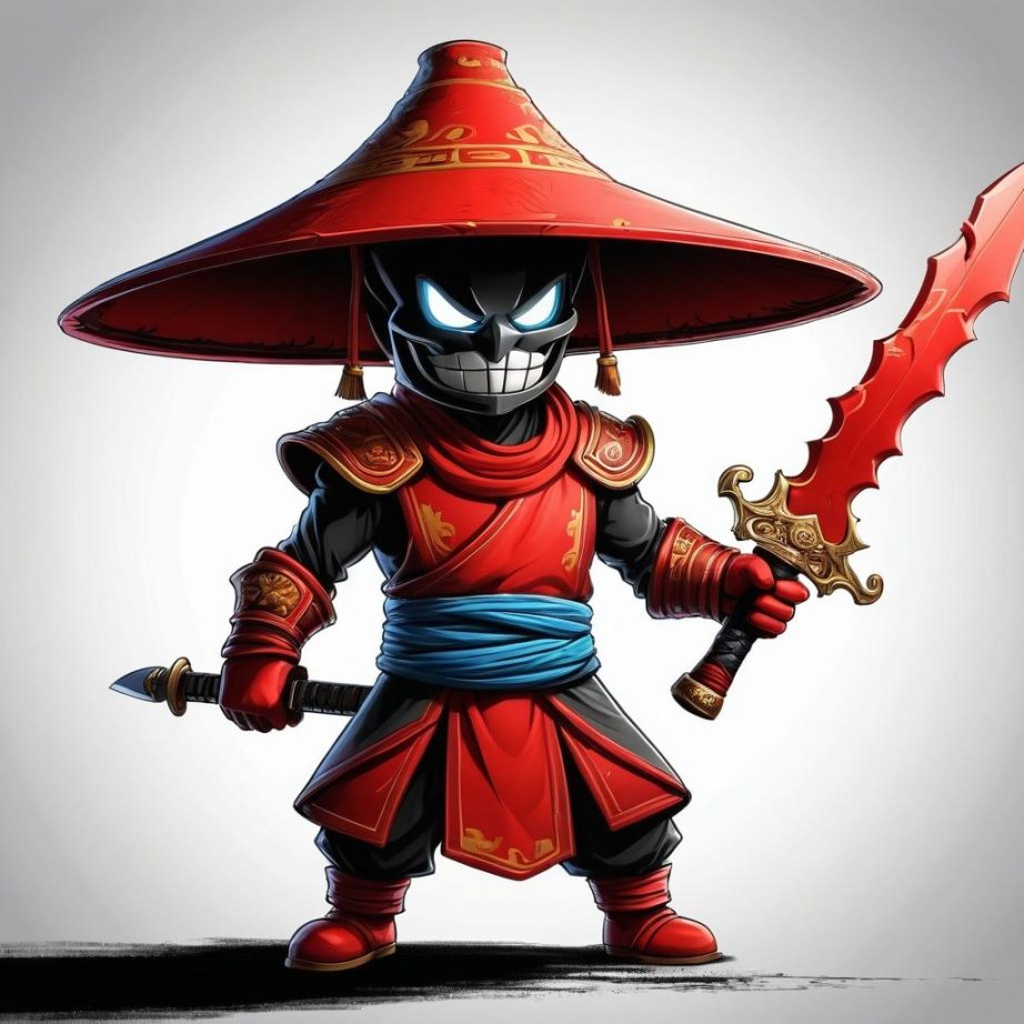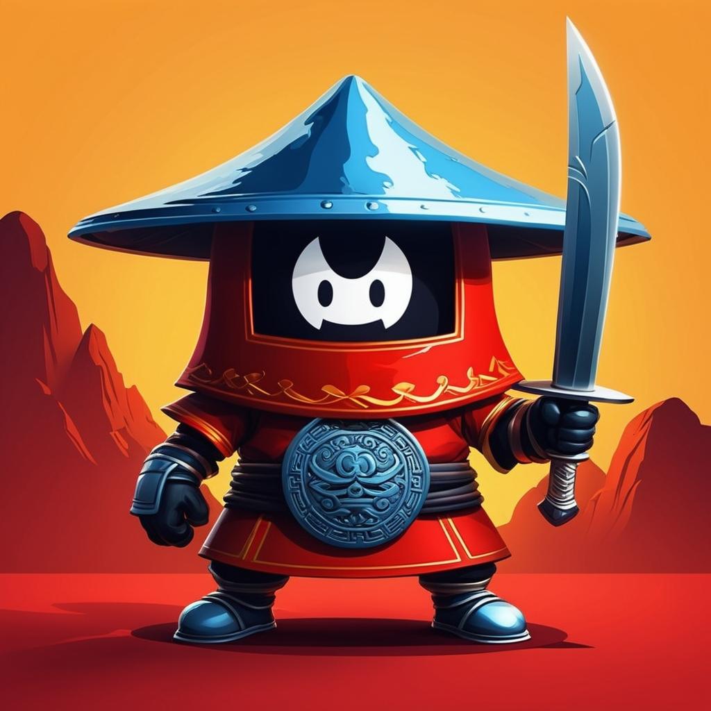 这幅作品展示了一位拟人化的辣椒武士,头戴斗笠,手持弯刀,形象生动且富有幽默感。作品使用了简单的线条和红色填充,创造了一个具有卡通风格的角色。画面背景为空白,使得角色更加突出,整个作品传达了一种轻松愉快的气氛。