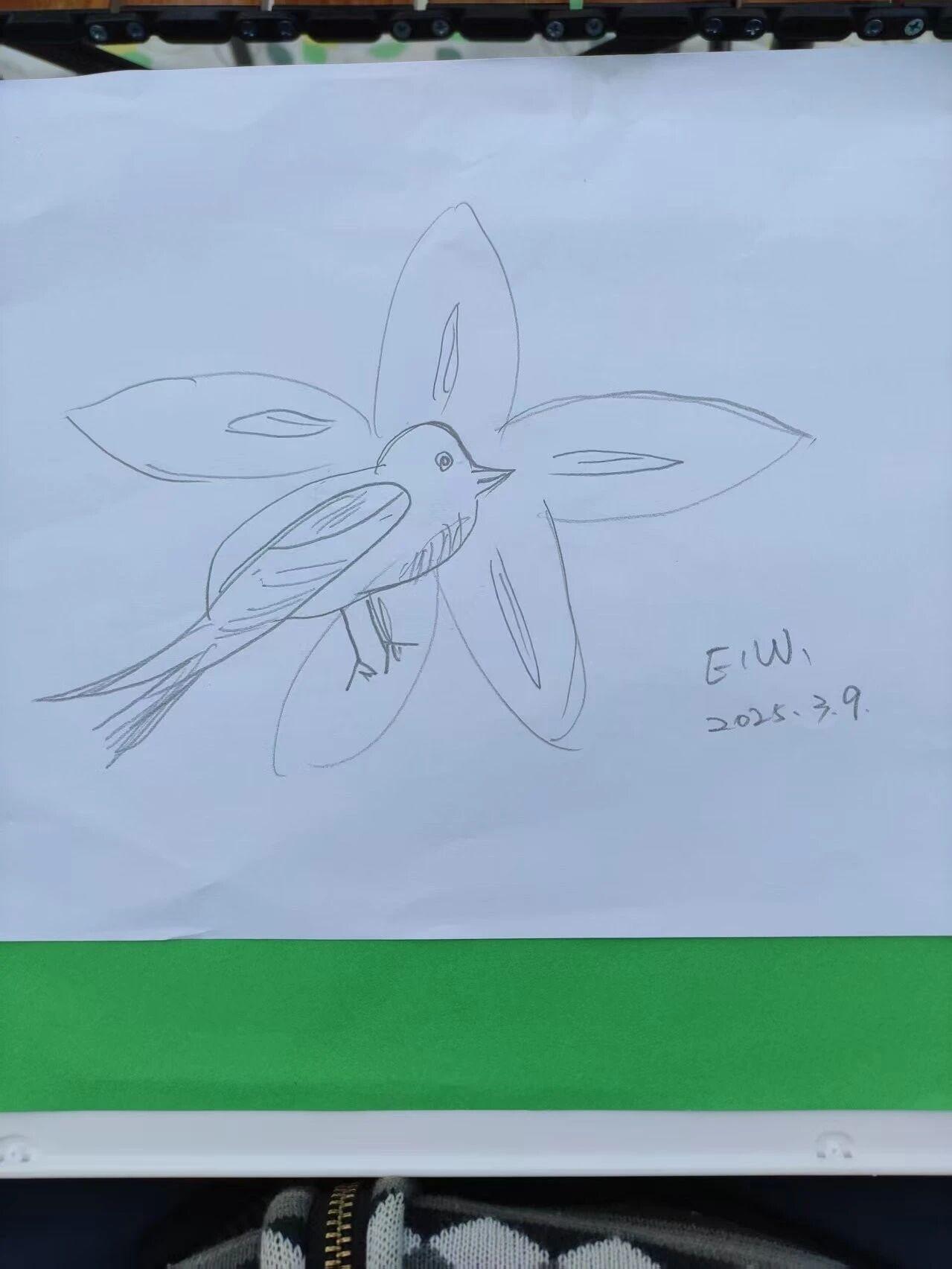 这幅画是一幅简单的铅笔素描,描绘了一只鸟站在一朵花的前面。画面构图简洁,主要元素是鸟和花瓣。线条流畅,表现出一种自然和谐的感觉。创作者可能想通过这幅作品表达自然的美和生命的联系。