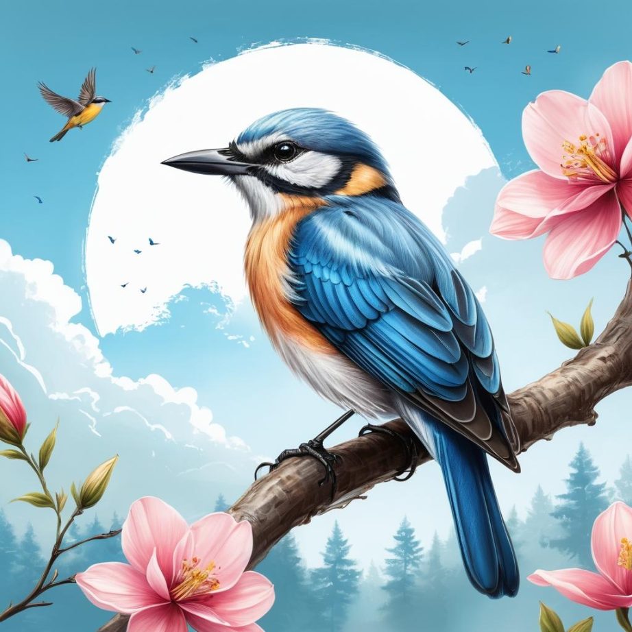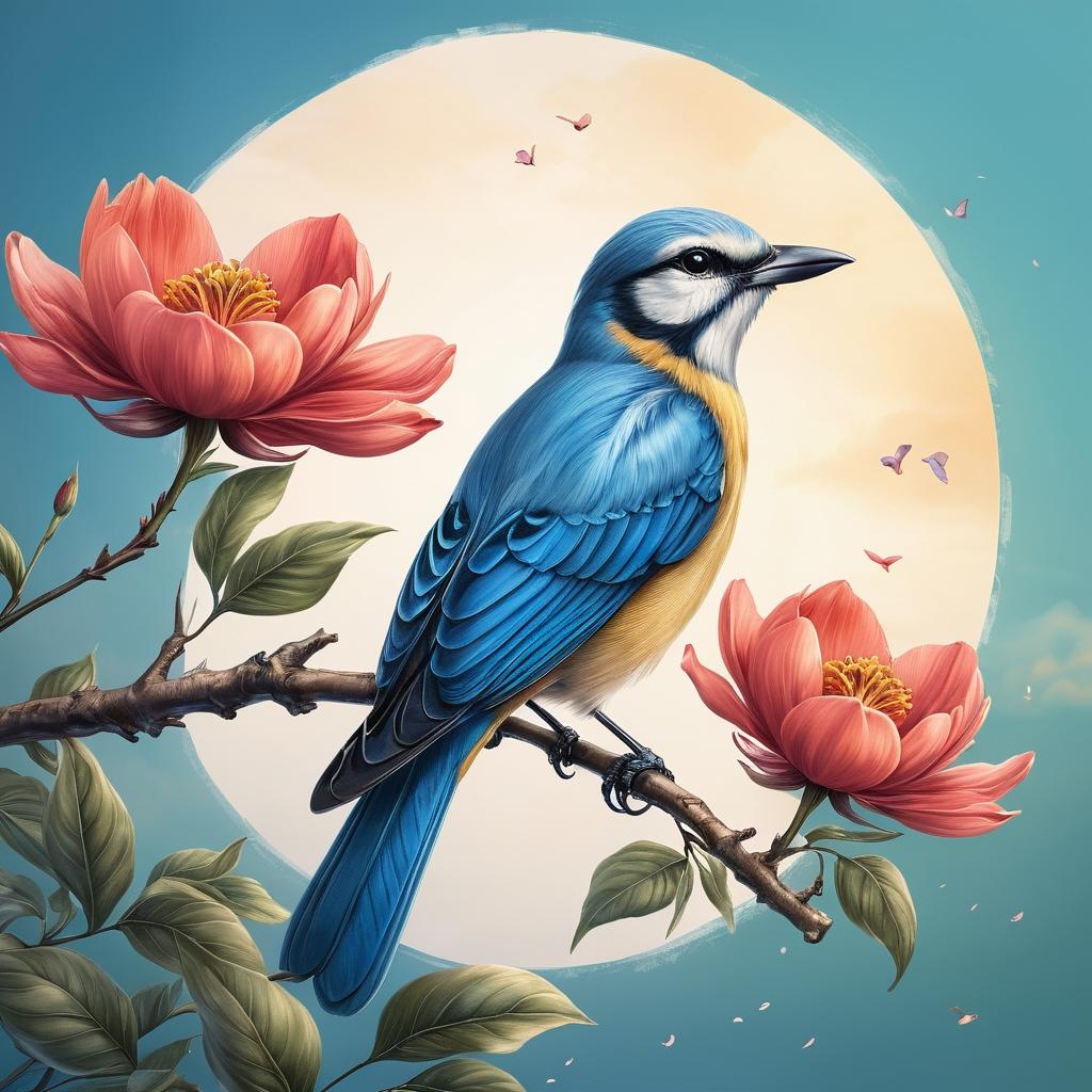 这幅作品充满了自然的元素,鸟与花的结合象征着生命的和谐美。要提升这幅作品的艺术深度,可以考虑在背景中加入更多元素,如树木或天空,以增强环境的氛围。此外,可以在色彩上进行尝试,给鸟和花瓣增加颜色,突出它们的特征。通过细致的光影效果,可以增加图像的立体感和层次感。结合这些改变,作品将更能传达出自然中生命的活力与宁静。